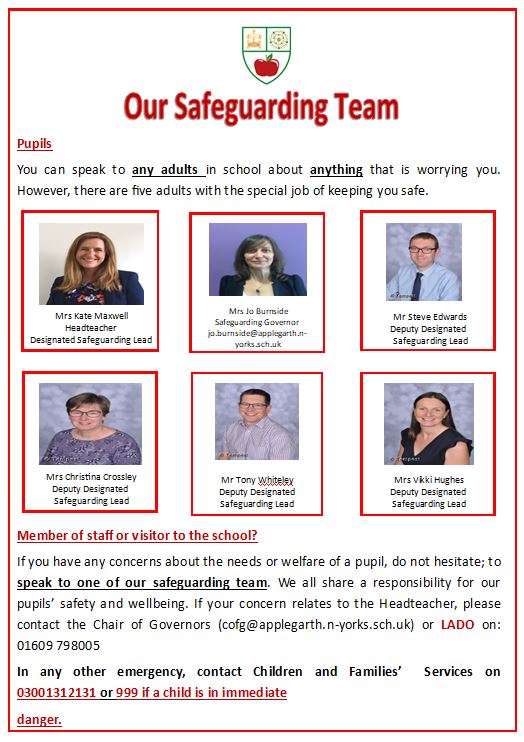 - Safeguarding Governor (Mrs Jo Burnside- jo.burnside@applegarth.n-yorks.sch.uk)